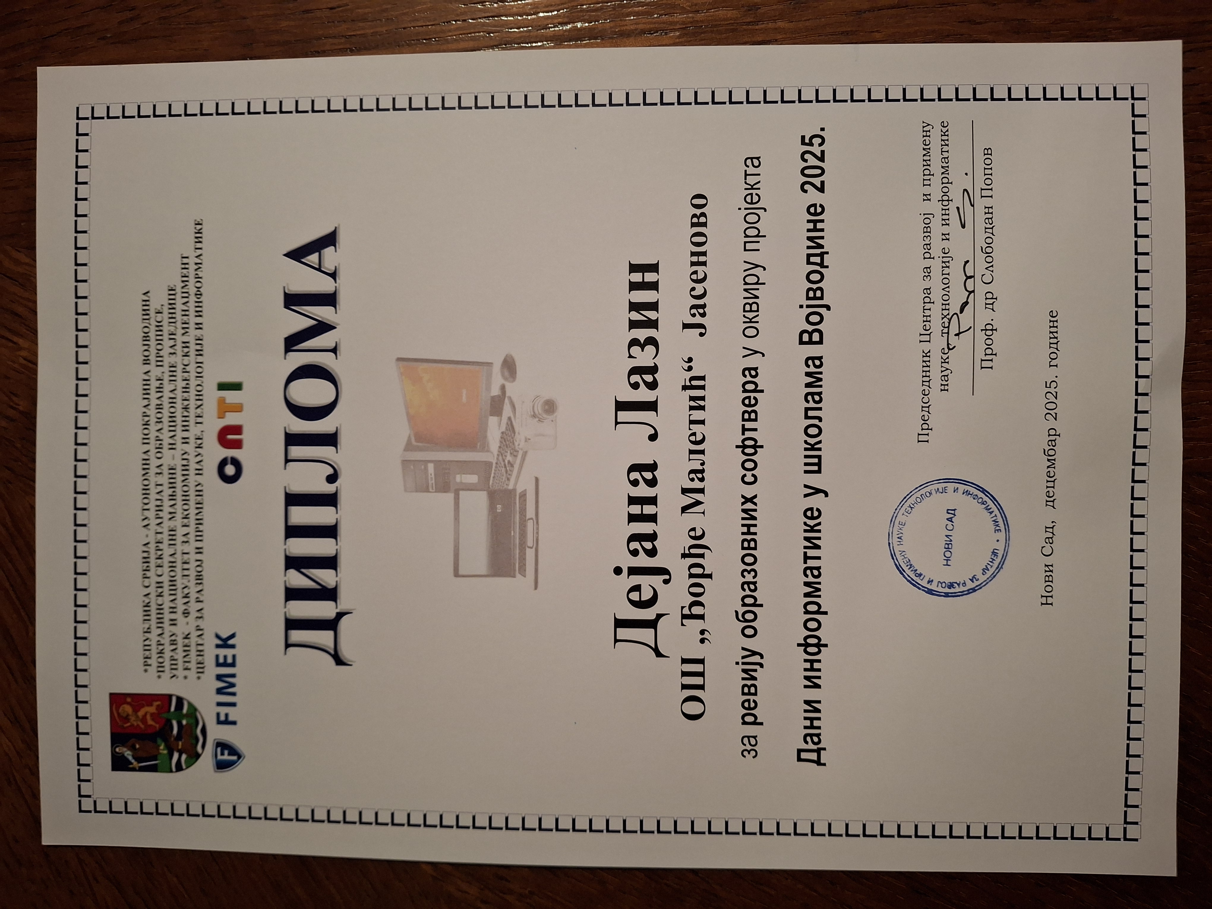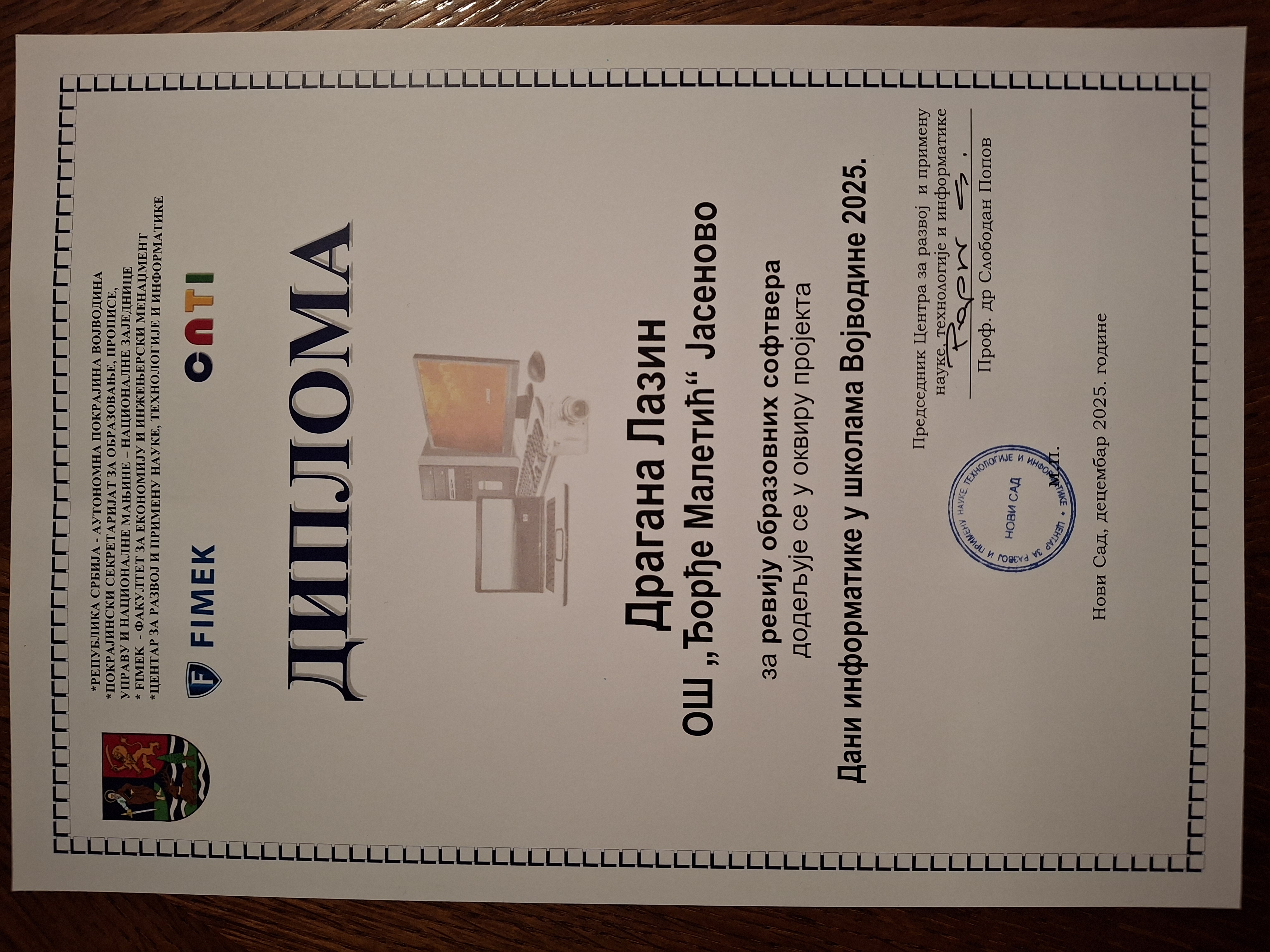 На завршној манифестацији пројекта "Дани информатике у школама Војводине 2025" који организује Покрајински секретаријат за образовање и Центар за развој и примену науке, технологије и информатике награђене су наставнице Драгана Лазин и Дејана Лазин. Ове године учествовало је више од 60 основних и средњих школа са територије АПВ, а манифестација је одржана по 20. пут.