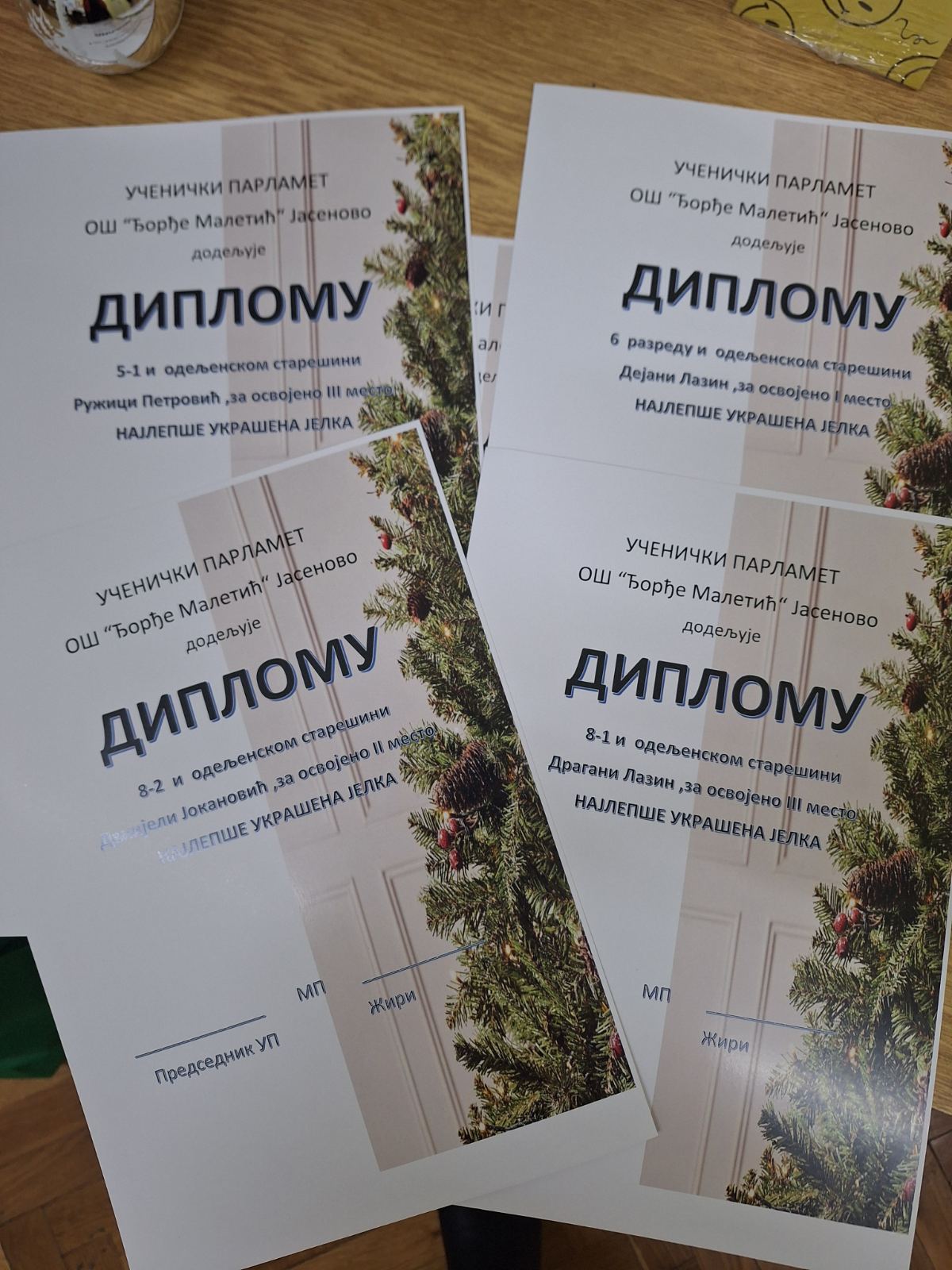 На предлог Ученичког парламента организована је акција ,,Најлепше украшена јелка" у оквиру које су додељене дипломе за најлепше и најкреативније новогодишње јелке, а осталим учесницима уручене су похвале за учешће.